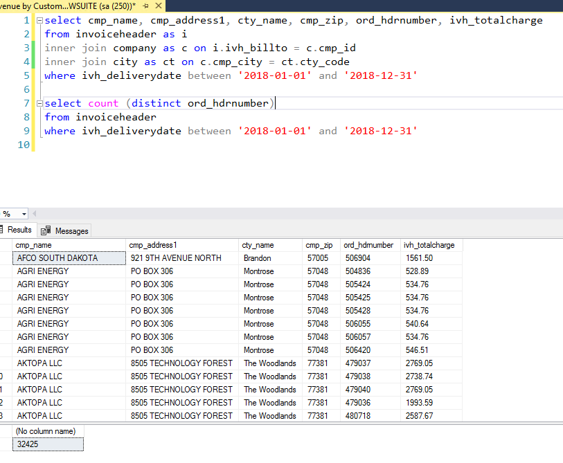I am still quite a beginner at this SQL querying, so I appreciate any help on this. I have pulled the data I need using the below query. Now I need to group the data by cmp_name and sum the ivh_totalcharge for each cmp_name. Also, need to make sure I pull distinct records from the field ord_hdrnumber from the invoiceheader table. Thank you for any help, I appreciate it.