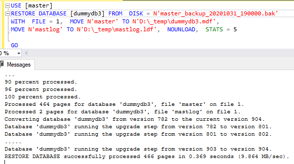 However, I also wrote some code years ago to automatically verify backups. It selects a random instance and a random database, restores it (as dummydb), runs an integrity check, then mails us the result. Sometimes that random database happens to be master. The integrity check fails (internal tables and so) but the restore succeeds, on a different version. So I'm curious why that didn't work for you. To be sure, I tested it manually, restoring from 2014 and 2017 to 2019 (screen shots added - version numbers from/to are visible). Both succeeded. So the article you link to might no longer be valid. I do remember seeing that error message from your screen shot with the auto-restore checks as well, but I can't remember what exactly cause it or what I did to solve it (might have been an upgrade or edition change).
