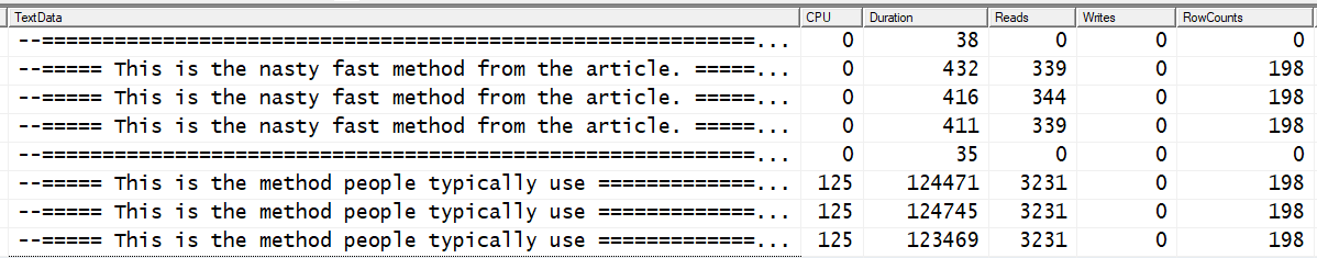 On modern machines, we still get 3 orders of magnitude difference in CPU and Duration (shown as micros seconds below) and a healthy order of magnitude difference in the number of reads.