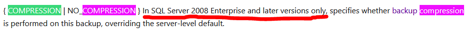Jeff Moden wrote:.... Compressed backups are only available in the Enterprise Edition for production environments (and Developer's Edition for development/testing environments)....