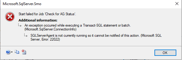 I am running into an issue and hoping to get some help. Every time I reboot my server, SQL Server service and agent starts automatically. I see that the Agent is running but when I run a job or any job, I get this error (See screenshot below). I then restart the SQL agent and it works. I don't see information in the log file where I know what to do to prevent this from happening. I do want the SQL server agent up and running after the server reboot without me having to restart it again. Any advise is highly appreciated.