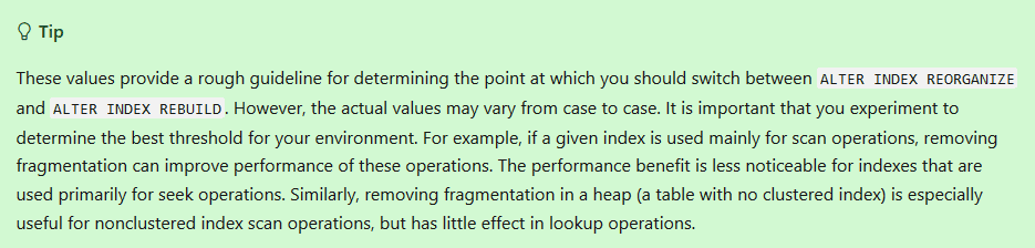 It turns out that REORGANIZE isn NOT your friend. For example, almost everyone says that the best reason to NOT use Random GUIDs is because of the massive number of page splits (quickly causing huge amounts of fragmentation). While there are a lot of other reasons to not use Random GUIDs, fragmentation isn't actually one of them. I have tests that prove that you can actually go for months with absolutely ZERO page splits or fragmentation and, again, Paul Randal actually mentions such a thing ( https://docs.microsoft.com/en-us/sql/relational-databases/indexes/specify-fill-factor-for-an-index?view=sql-server-ver15 )...
