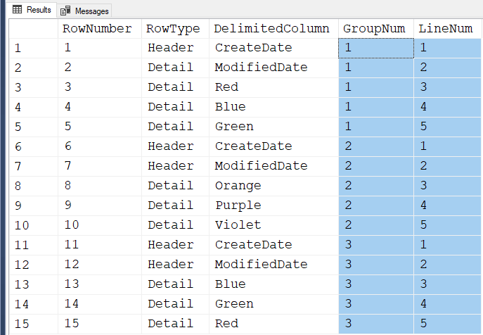 INSERT INTO #Test (RowNumber,RowType,DelimitedColumn) VALUES (15,'Detail','Blue')