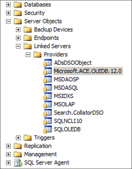 To verify if the ACE drivers have been loaded or not, open the Object Explorer window in SSMS, drill down to {Server Objects}, {Linked Servers}, and {Providers}. You should see an object like the one I've highlighted in Gray. It will end with the number 12, 15, or 16. There may be more than one and that would make for a Martha Stewart moment. Let us (as opposed to "cabbage") know. 😀