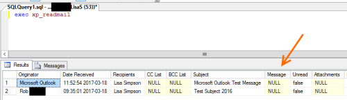 I ran across that as well in the "Discontinued items in Exchange 2016" article, though Im not sure that is related exactly to SQLMail, even though it uses MAPI. What Im struggling to understand though, is that xp_readmail executes successfully and pulls in other information, but not the body (@message). Take a look at the image attached. So its "working" but just not that field. Also, Ive researched the MAPI/CDO library and what will show in the logs if an unsupported connection comes into exchange and Im not seeing the error messages - its says just the opposite that the connection occurred and was accepted.