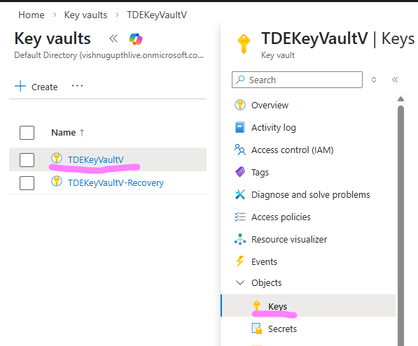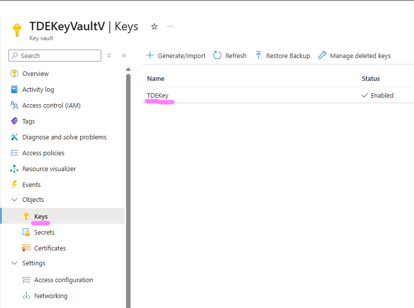 Select the vault 'TDEKeyVaultV ' that contains your EKM key. In the left pane, under Objects, select Keys as shown below.