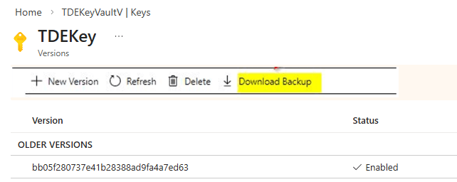 Selecting the key 'TDEKey' as shown above exposes the Download Backup option, as shown in the image below, which generates the encrypted key blob required for disaster recovery.