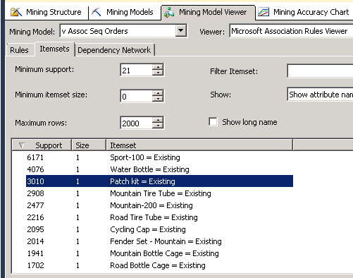 If we move to the Itemset we can also find some information: The Support, size and the Itemset. It is the information related to each item in the orders. The support is the number of orders of each item. As you can see, the Sport-100 and the Water Bottle are really popular items.