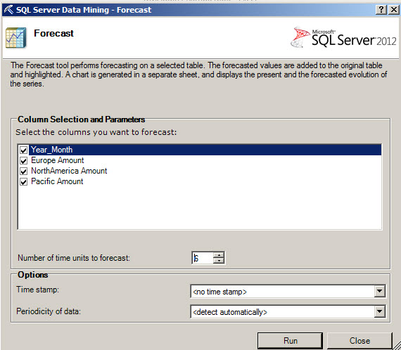 3. Select the columns used as parameters and specify the number of time units to forecast to 6 and press Run.