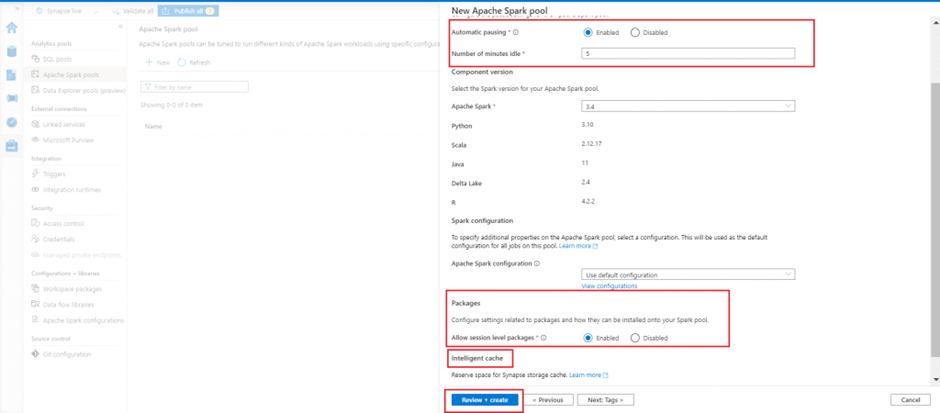 I press the Review+ create button to create the Spark pool.