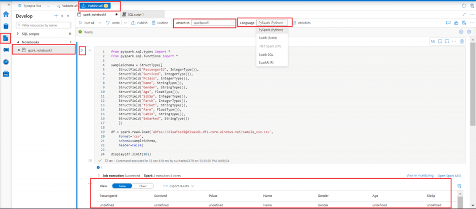 The primary language for the newly added cells can be selected from the language menu at the top of the notebook. I am using pyspark as the language for my notebook. In the notebooks, a SparkSession instance is automatically created and stored in a variable called spark. There's also a variable called sc for SparkContext.