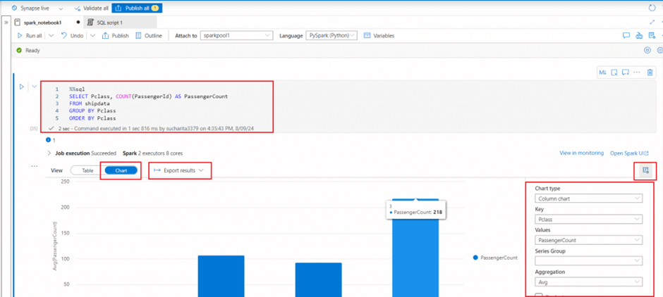 I add a new code cell. I write pyspark code to select two columns from the df dataframe and save in a new dataframe named ticket_df. In the next statement, I select the two columns and filter the rows based on a condition using where clause. In the third statement, the ticket_df dataframe is populated with the count of passangers in each class using the group by clause and count function.