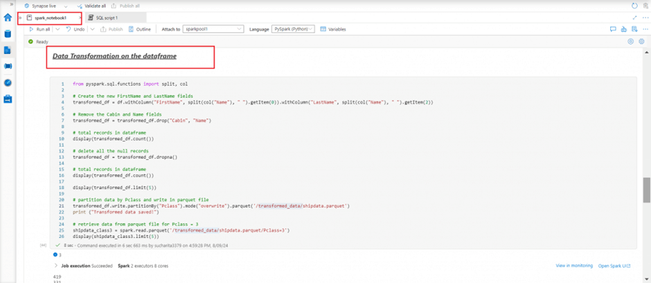 I create a view named shipdata from the dataframe. Then I use the spark.sql module to write SQL select statement to retrieve data from the view and populate in another dataframe. In the next cell, I write the SQL select statement directly without spark.sql module. I use the magic command %%sql to change the language of the cell from pyspark to Spark SQL.