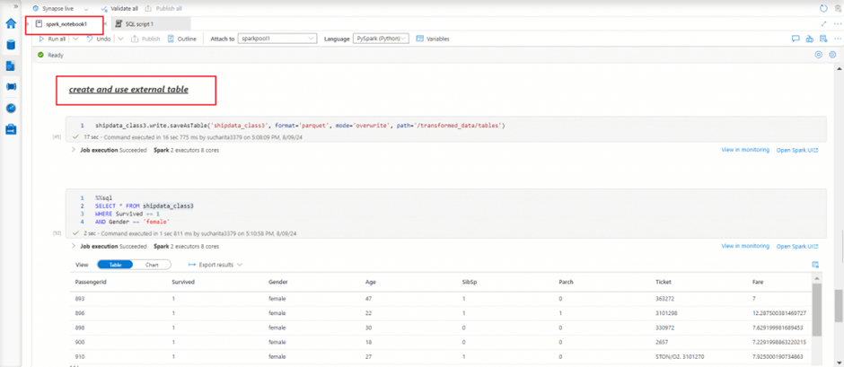 I create an external table from the dataframe populated in previous step and mentioning a relative path for the data files of the table. In the next cell, I write a SQL query to retrieve data from the table.