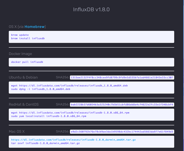 On this page you can find also Chonograf and Kapacitor, which are respectively the data visualization tool and the time-series processor engine, that will be object of a future article. You can install InfluxDB by clicking on the button “v1.8” and following the instructions related to the operating system you are running on: