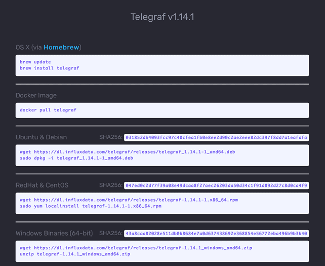 wget https://dl.influxdata.com/telegraf/releases/telegraf_1.14.1-1_amd64.deb sudo dpkg -i telegraf_1.14.1-1_amd64.deb