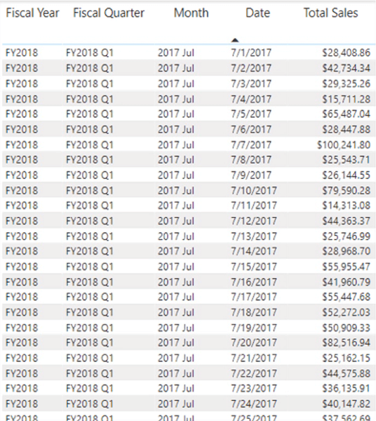 As you can see, the DATESMTD measure appears to be working as expected. For each date row, the month-to-date addition appears to be working correctly. Moreover, when we scroll to the month end of July, and focus upon the 8/1/2017 date row, the measure resets to reflect the Total Sales for the single day of the new month, as depicted and highlighted.
