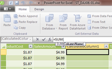 Syntactically, in using the SUM() function to return a subtotal or total, we specify the value we wish to test within the parentheses to the right of the SUM keyword. As an illustration, we cite the use of SUM() within the Reseller Sales tab of the PowerPivot window within which we have been working. Let's say we employ SUM(), via a calculated column, in the following manner to add all numbers resident in the ProductStandardCost column: