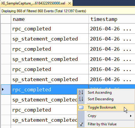 Having found rows containing the data of interest, you have the ability to bookmark them in the viewer (those of you familiar with Profiler may be used to writing down row numbers to remember where something was located…this is a thing of the past!). Highlight the row of interest and then select the Bookmark button in the Extended Events ribbon (you can also right-click on the row and select Toggle Bookmark). The bookmark icon will appear in the viewer to the left of the row.