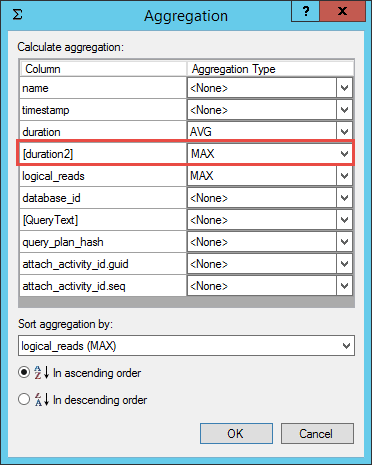 You can apply different aggregates to different fields, such as AVG for duration and MAX for logical_reads, but only one aggregate can be applied to a field at a time. That is, you can only view the AVG, or only the MAX for a field. There is an interesting way to work around this, if you're interested in viewing different aggregations for the same field. You can create a merged column that represents that column. For example, if I wanted to see the AVG duration and also the MAX duration, I would apply the AVG aggregation to the duration field, then I would create a merged column on the duration field (with a slightly different name) and another field that always has a zero value, such as connection_reset_option. Once you have the merged column, you can apply the MAX aggregation to it.